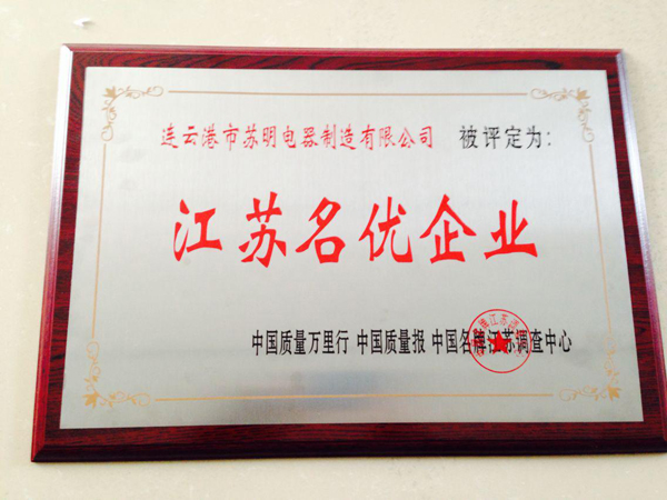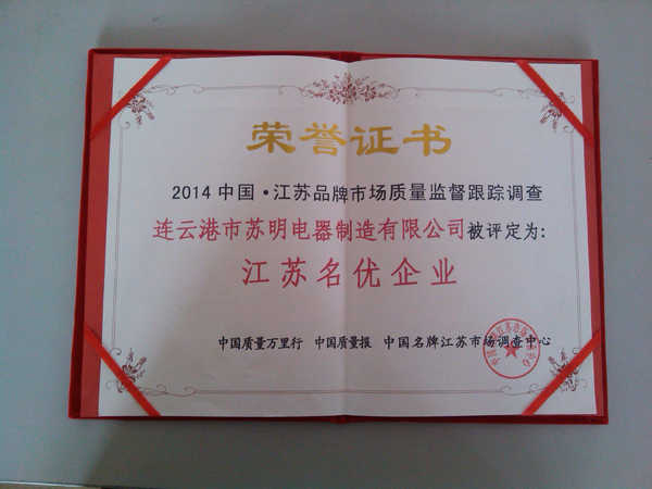 在2014年3.15到來之際,連云港市蘇明電器制造有限公司被中國.江蘇品牌市場質量監(jiān)督跟蹤調(diào)查中心評為 “江蘇名優(yōu)企業(yè)”。